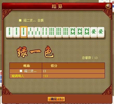绿一色,国标麻将规则的番种。由23468条及“发”字中的任何牌组成的顺子、刻子、将的和牌。不计混一色。如无“发”字组成的和牌,加计清一色、断幺,该番种计88番。